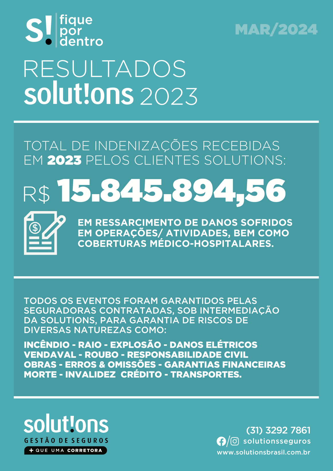 A corretora de seguros Solutions foi responsável por gerenciar o total de R$ 15.845.894,56 milhões de indenizações decorrentes do acionamento dos seguros contratados sob sua intermediação junto às seguradoras com as quais opera e garantem os riscos de seus clientes.